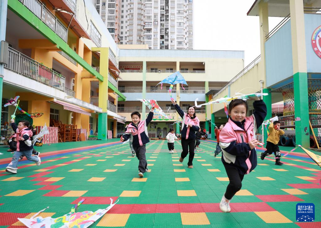 3月20日,貴州省黔南布依族苗族自治州都勻市第六幼兒園的老師和小朋友在放風箏。