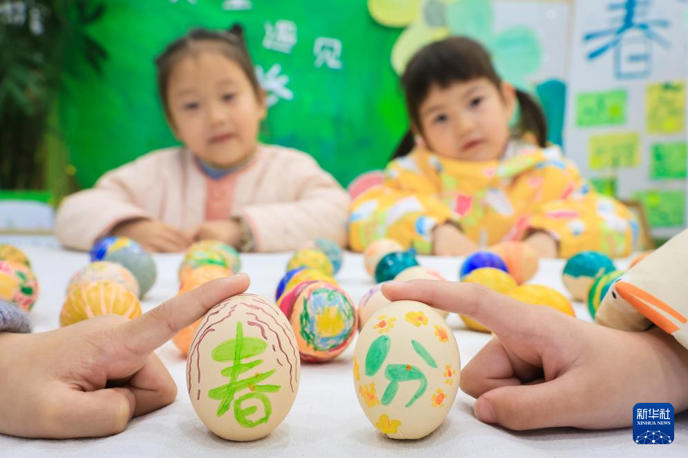 3月20日,在江蘇省揚州市江都區育才幼兒園,小朋友們體驗“立蛋”習俗。