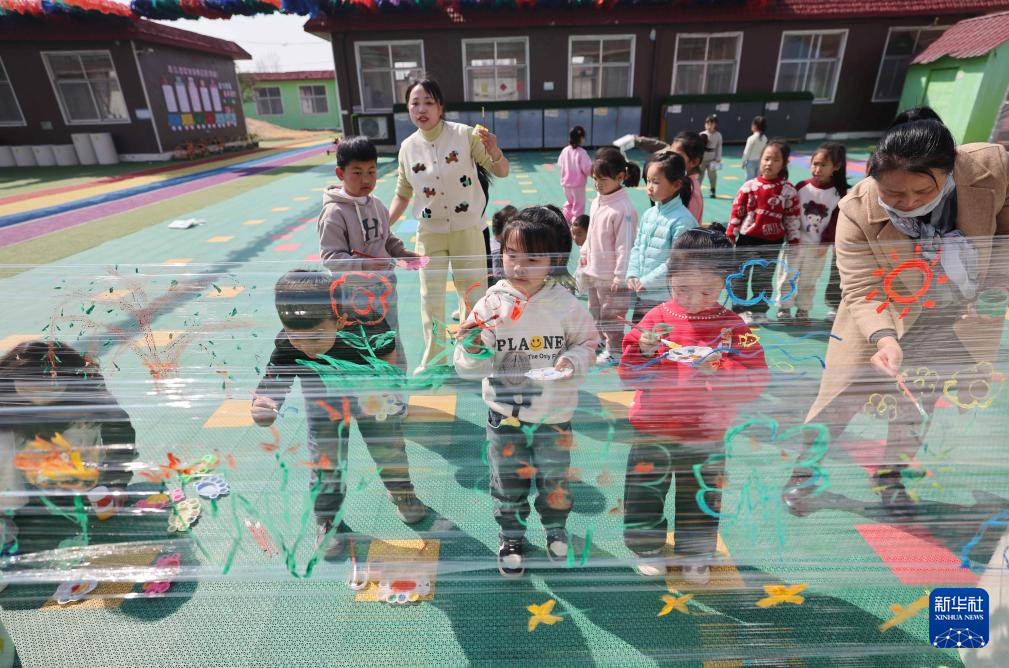3月20日,在山東省臨沂市沂南縣湖頭鎮中心幼兒園,小朋友在老師的帶領下描繪春天。