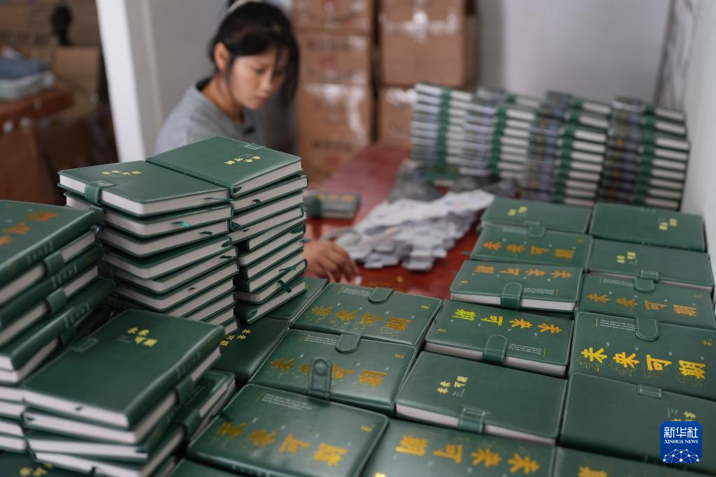 3月20日,工作人員在寧波素年工藝品有限公司生產車間包裝一款文創筆記本。