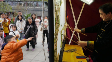 3月19日,在任煒漢繡工作室附近的公園里,漢繡愛好者在觀看任煒漢繡工作室的漢繡作品。