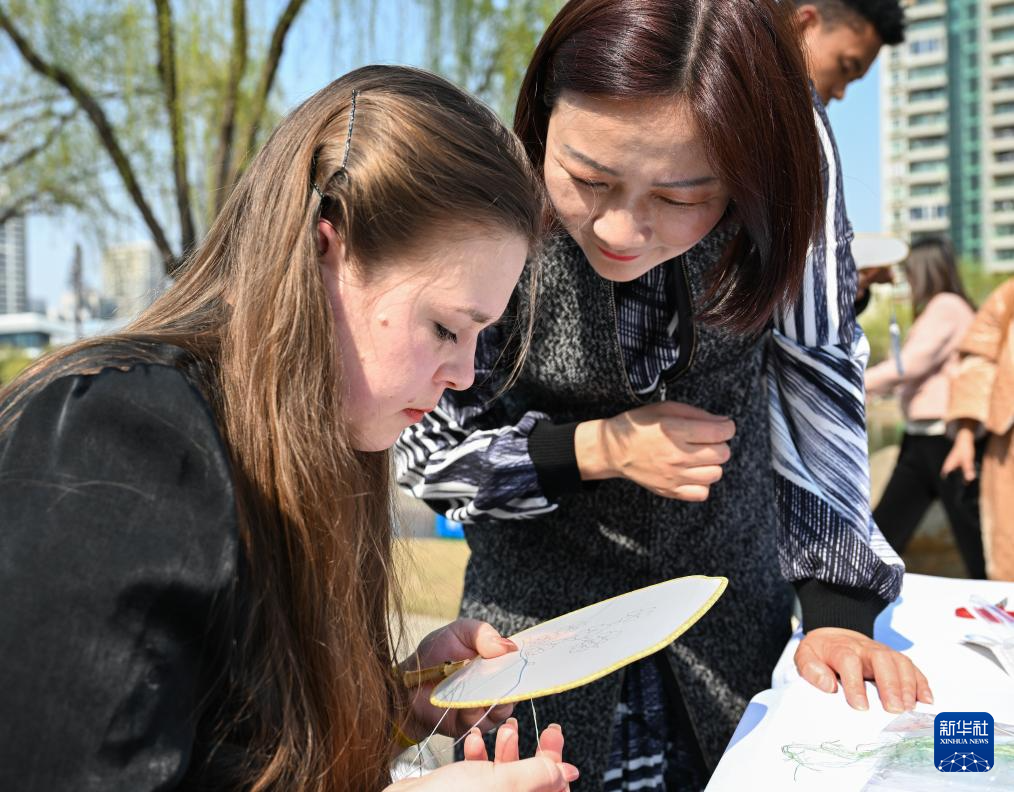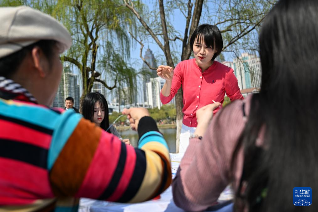 3月19日,在任煒漢繡工作室附近的公園里,任煒的女兒王煒佳在與漢繡愛好者交流漢繡技法。