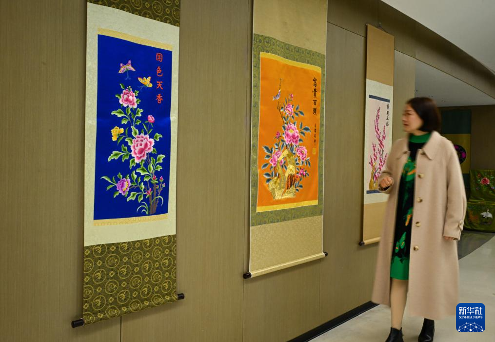 這是3月14日在任煒漢繡工作室拍攝的漢繡制品。