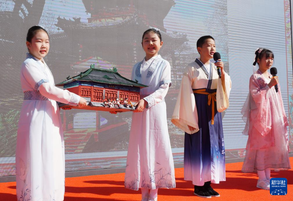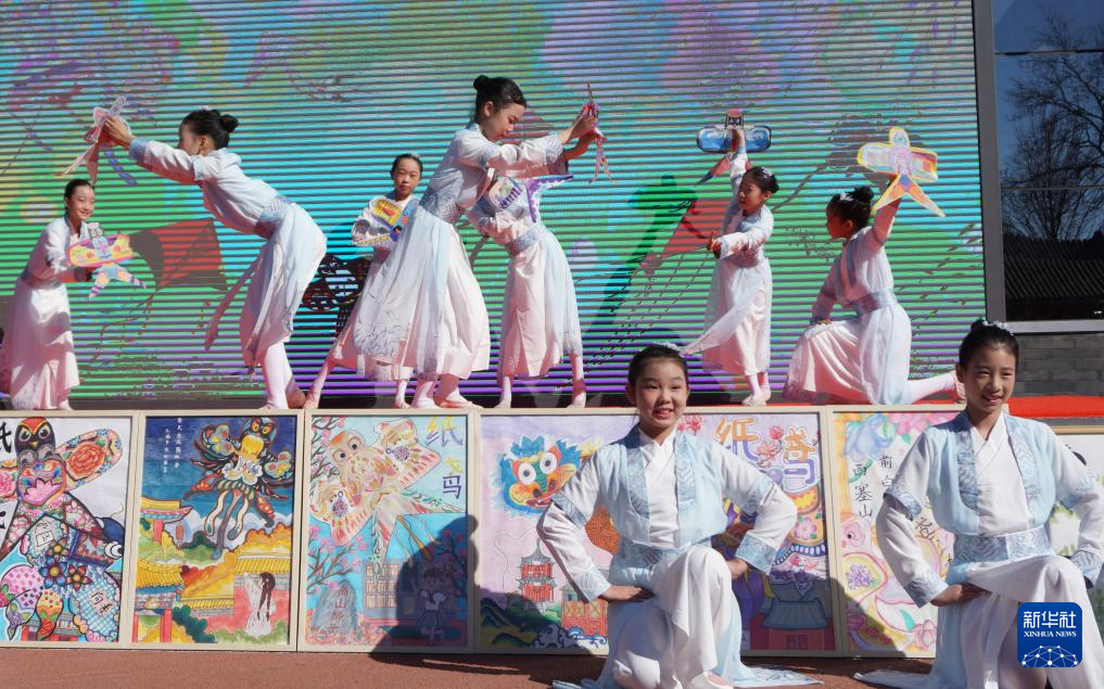 3月24日,府學胡同小學學生在書畫攝影展開幕式上表演歌舞。