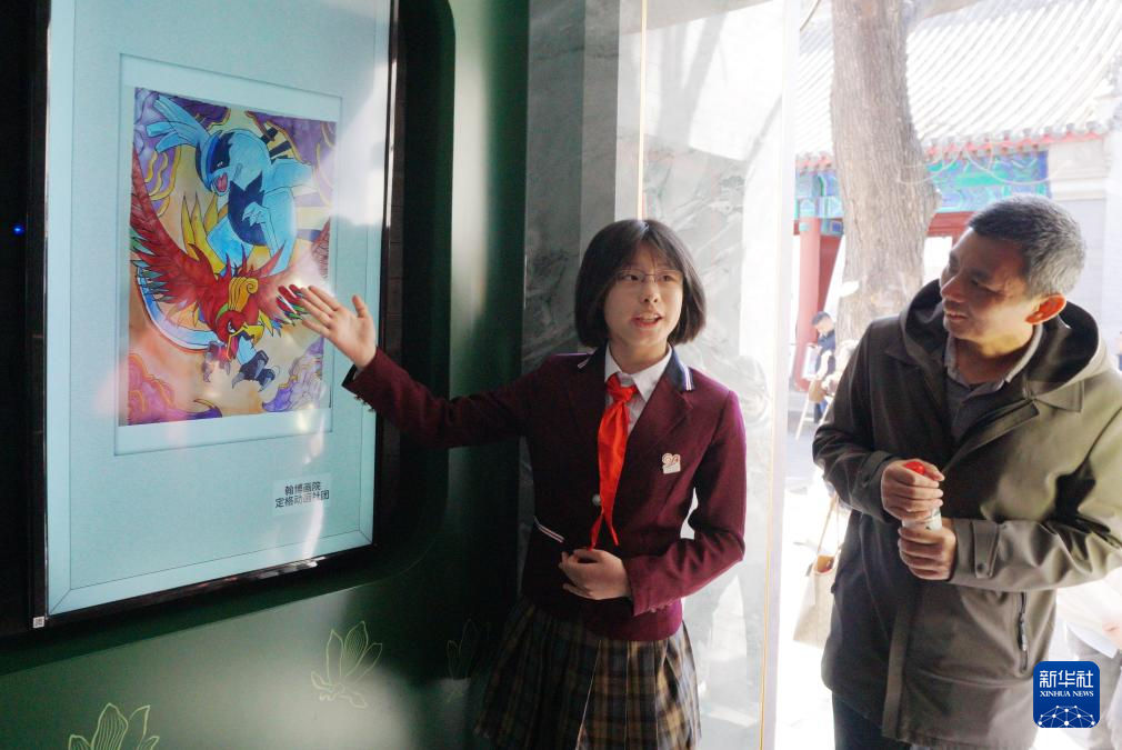 3月24日,府學胡同小學學生向來賓介紹學生創作的作品。