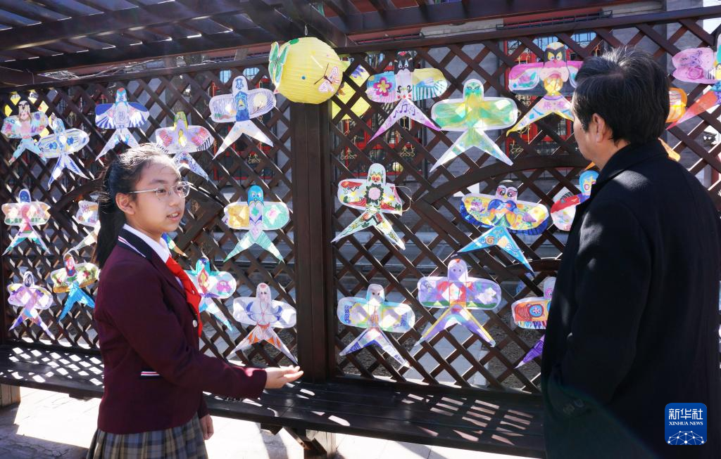 3月24日,府學胡同小學學生向來賓介紹同學們繪制的風箏。