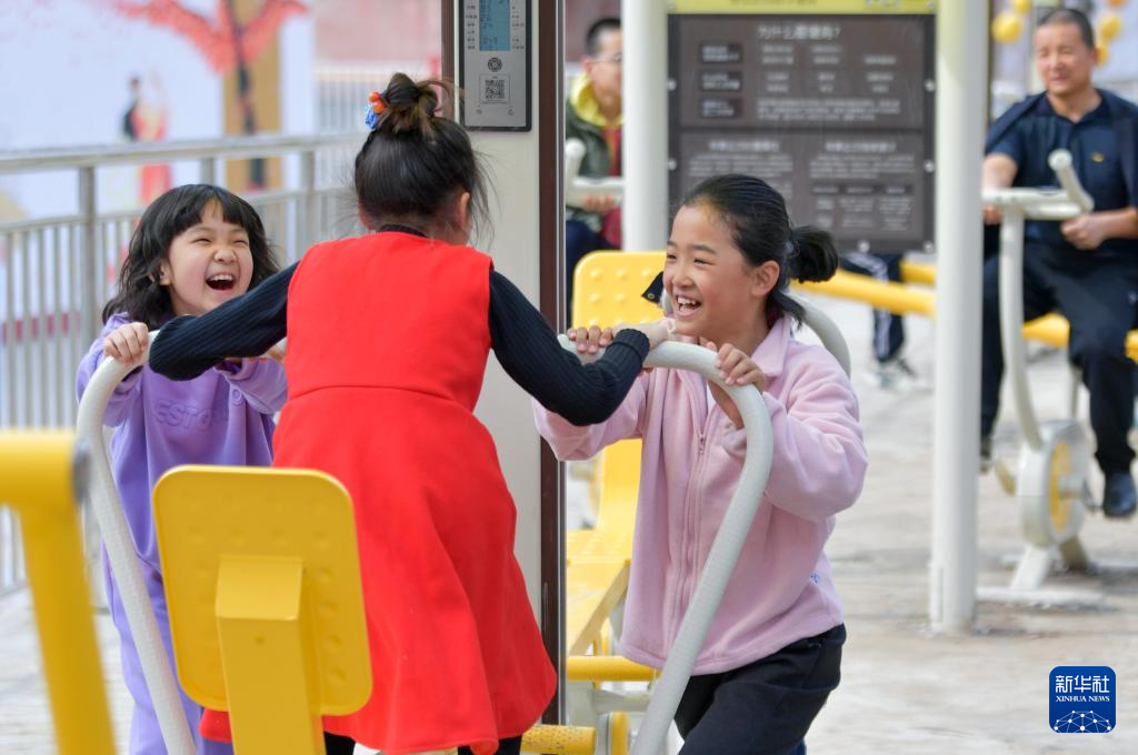 在烏魯木齊市水磨溝區葦湖梁片區立井南社區居委會院中,小朋友在運動設施上鍛煉身體(3月22日攝)。
