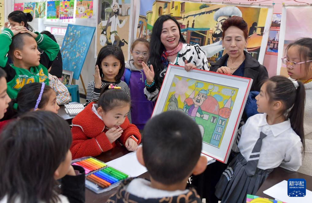 在烏魯木齊市水磨溝區葦湖梁片區立井南社區,老師在公益美術課上為孩子們講解繪畫過程(3月22日攝)。