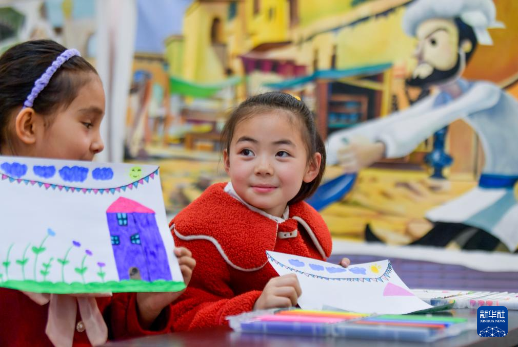 在烏魯木齊市水磨溝區葦湖梁片區立井南社區,小朋友在公益美術課上學習繪畫(3月22日攝)。