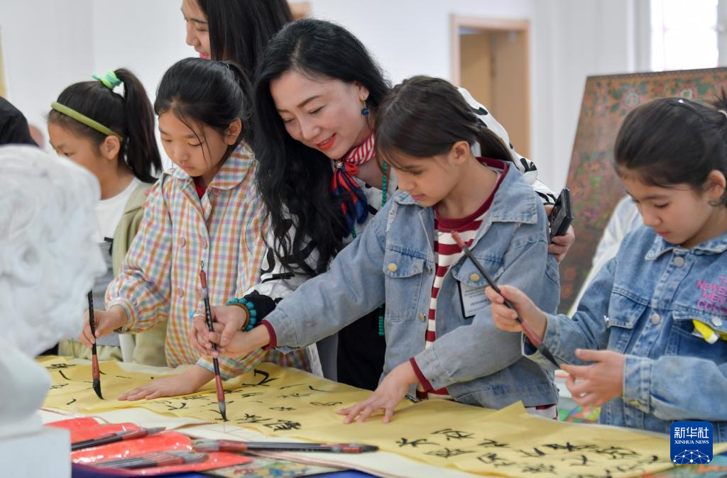 在烏魯木齊市水磨溝區葦湖梁片區立井南社區,小朋友在公益書法課上跟隨老師體驗寫書法(3月22日攝)。