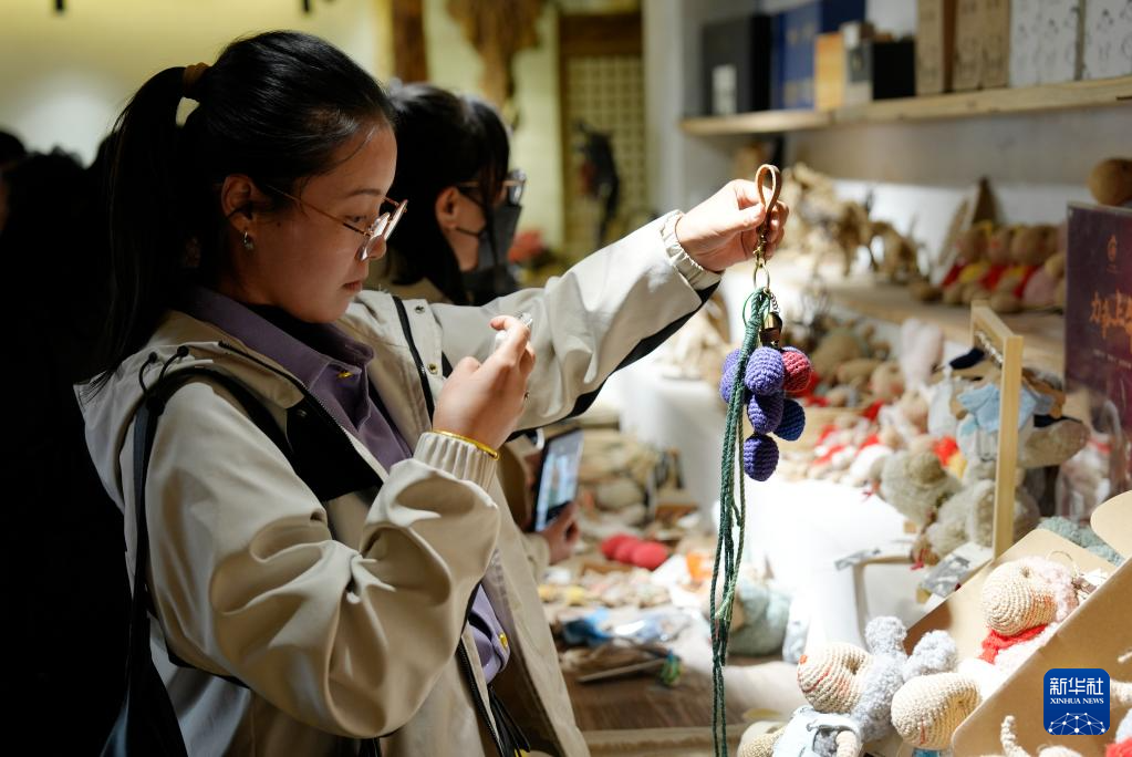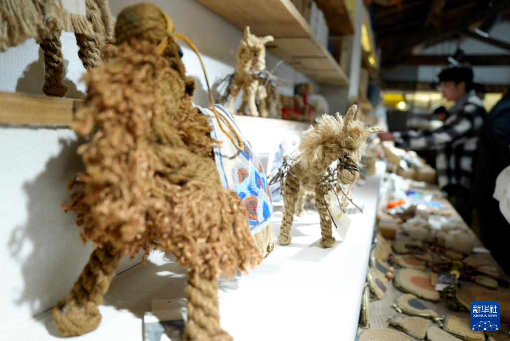 3月26日,參觀者在寧夏非遺麻編傳承基地選購文創產品。