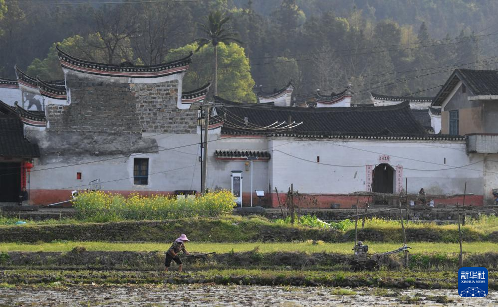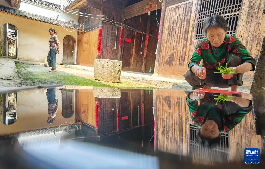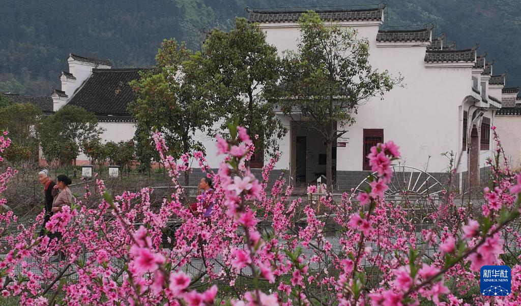 3月25日,村民在周家大院“子巖府”外桃園里散步。
