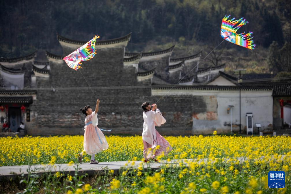 孩子們在周家大院“子巖府”外放風箏(2025年3月2日攝)。