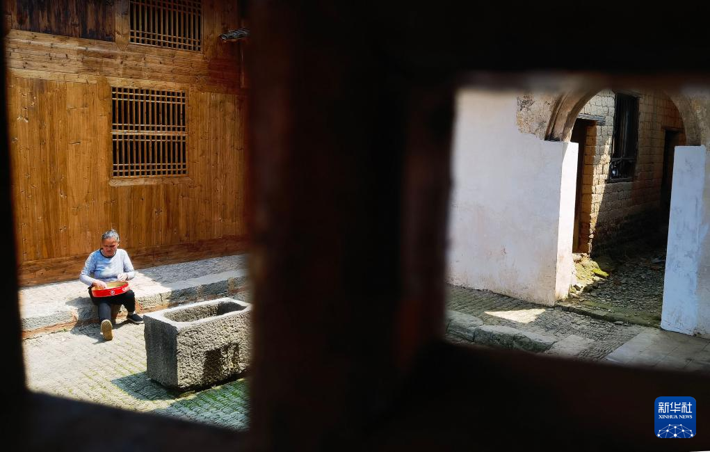 3月26日,村民坐在胡家大院的院坪中選豆子。