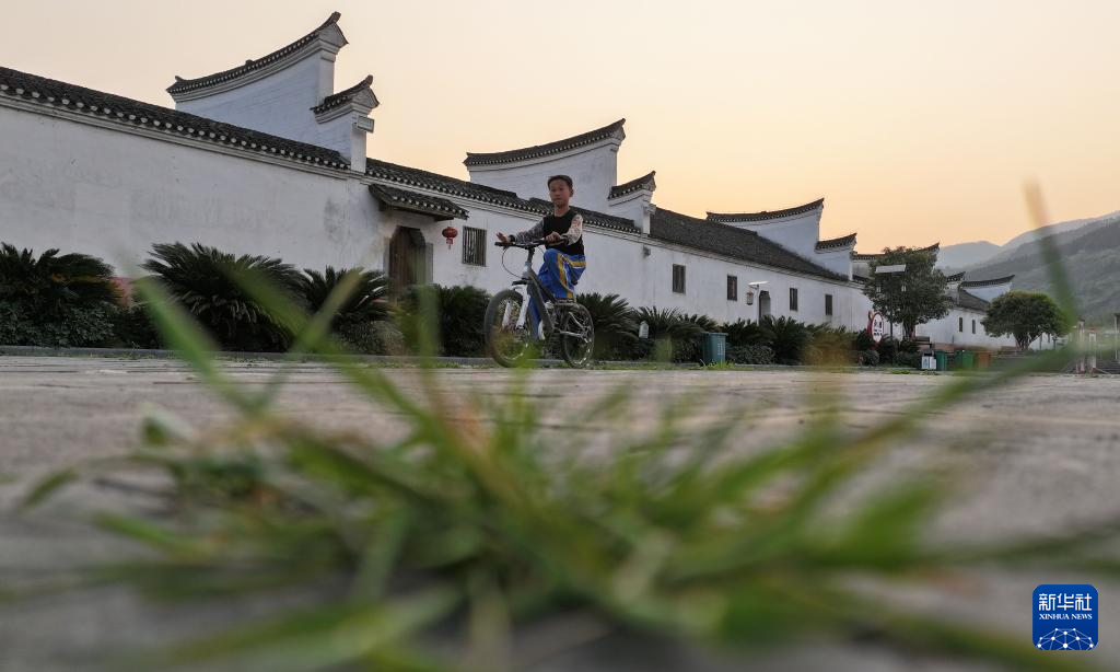 3月25日,小朋友在周家大院“子巖府”外騎自行車。