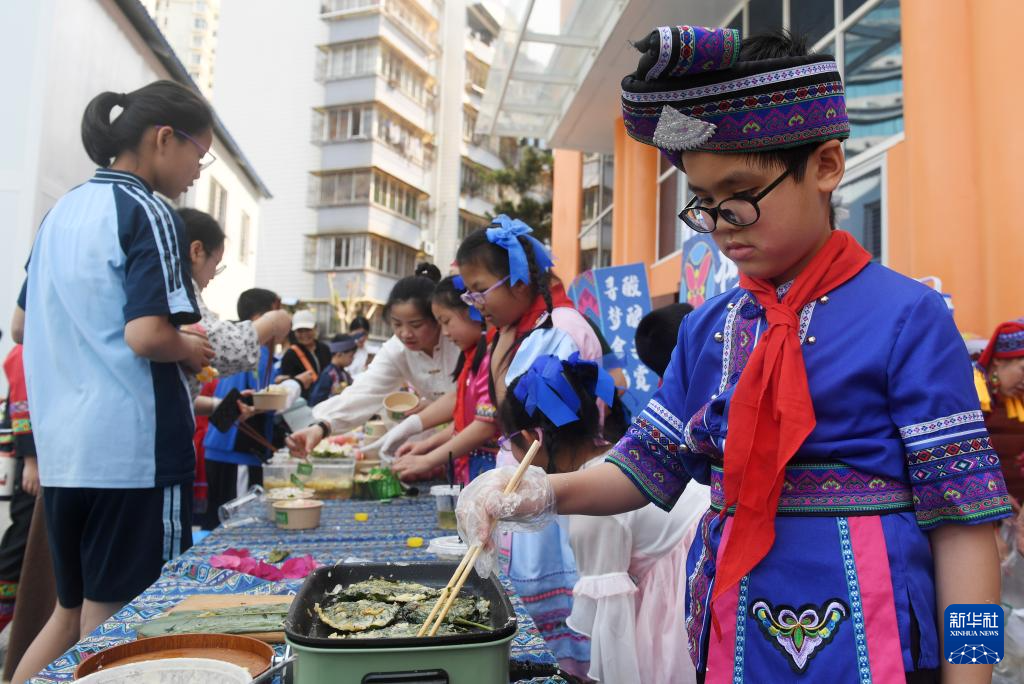 3月27日,孩子們在廣西南寧市民族大道東段小學品嘗傳統美食。