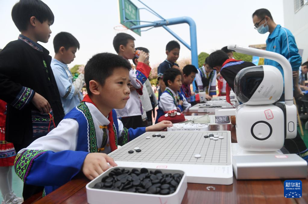 3月27日,在廣西南寧市濱湖路小學,學生在和機器人下圍棋。