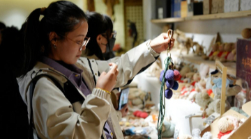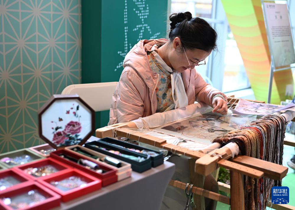 3月29日,嘉賓在嘉亭薈舉行的文旅市集上展示非遺項目“蘇繡”。