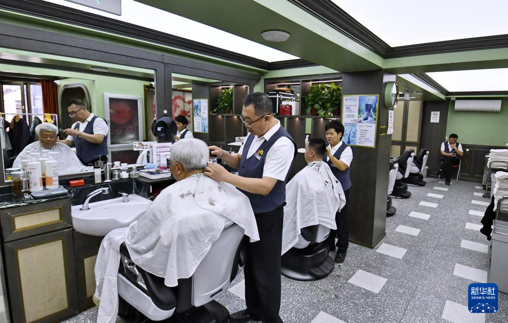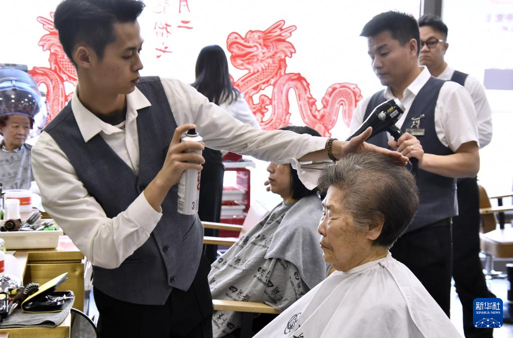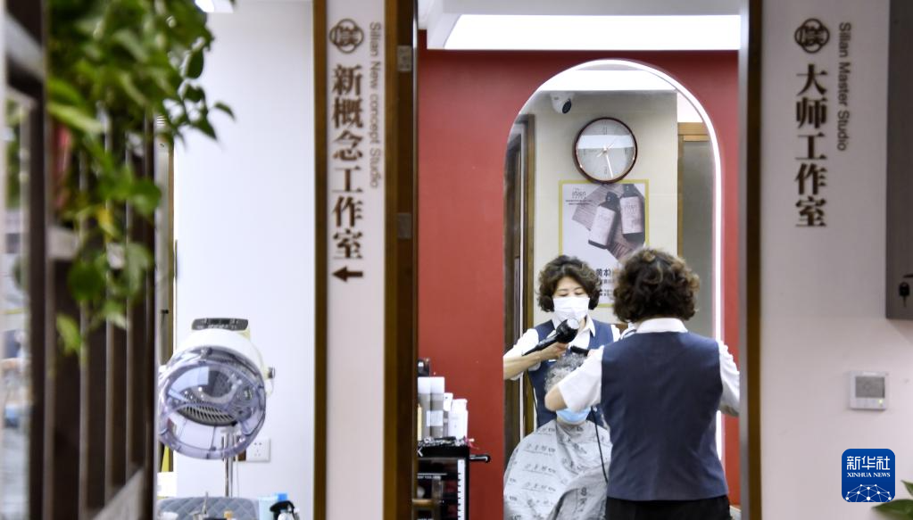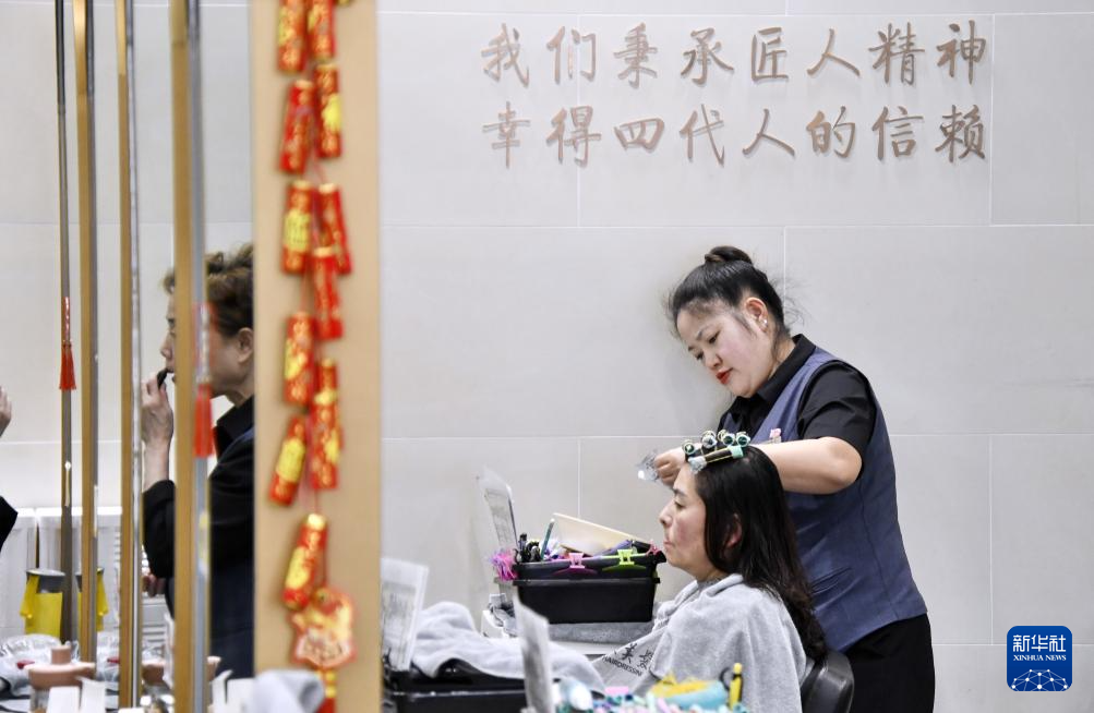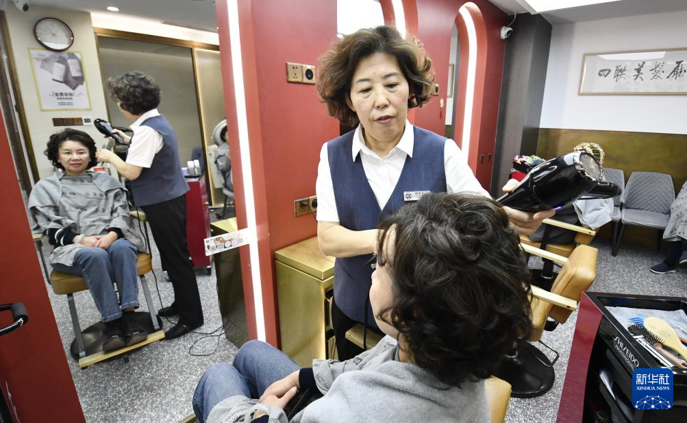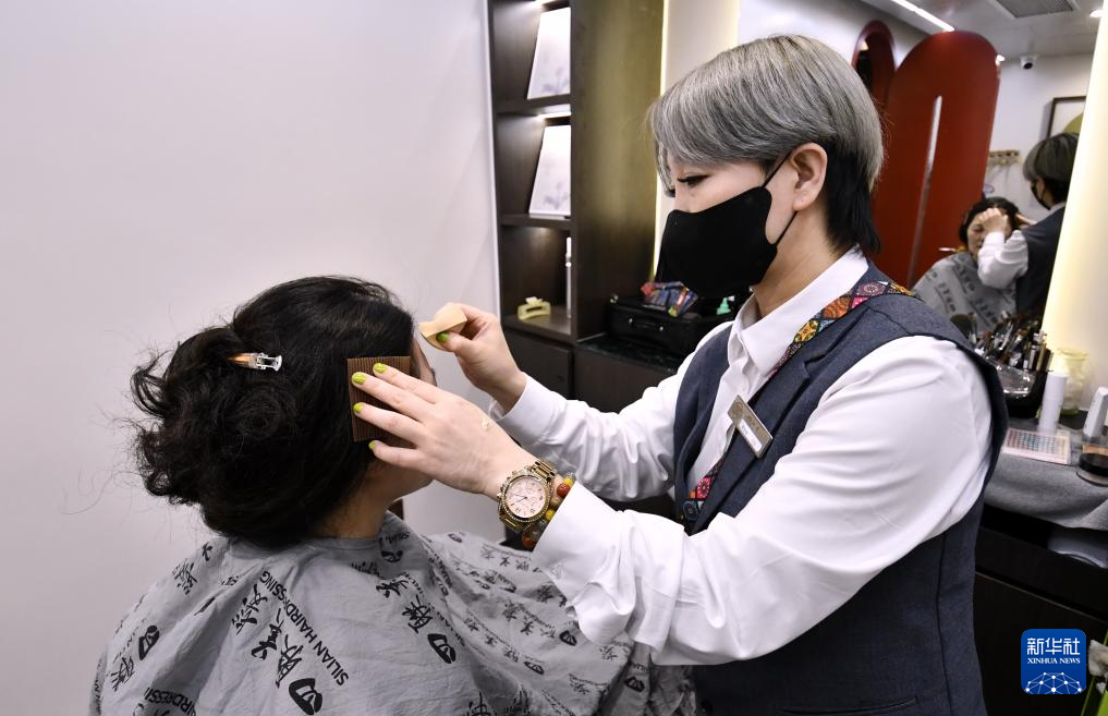 3月20日,歸秀鳳在四聯美發王府井店的大師工作室內為顧客美發。
