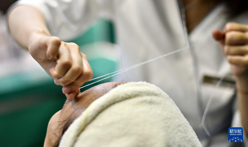 3月20日,四聯美發王府井店的技師在用傳統的“絞臉”技藝為顧客做面部美容。
