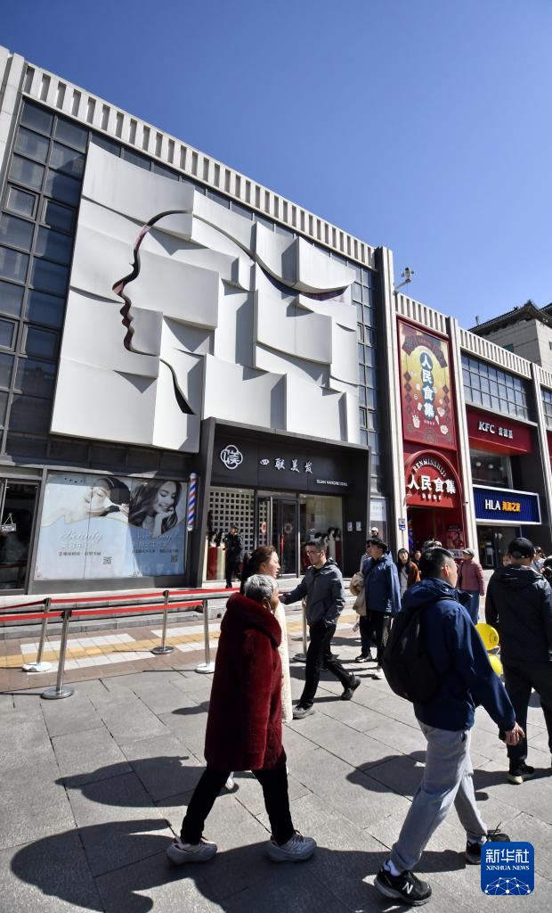 3月30日,游人從王府井商業街的四聯美發店前走過。