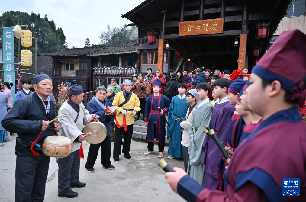 3月30日,人們身著傳統服飾在宣恩縣椒園鎮慶陽古街前表演國家級非物質文化遺產“薅草鑼鼓”。