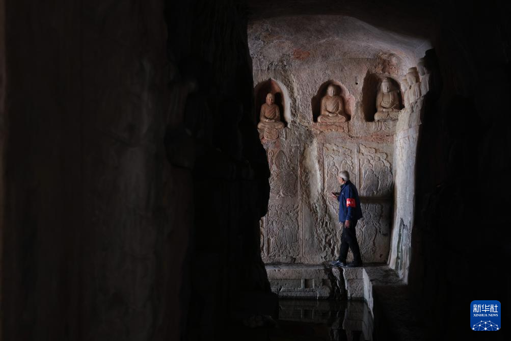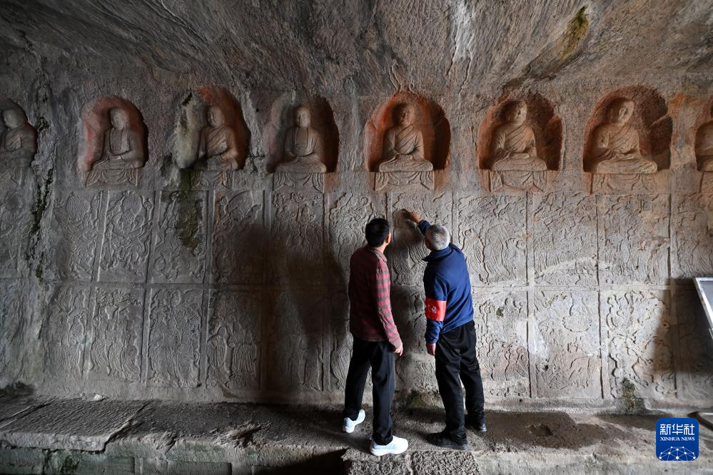 3月26日,馮開平在金燈寺查看一處摩崖造像的保存狀況。