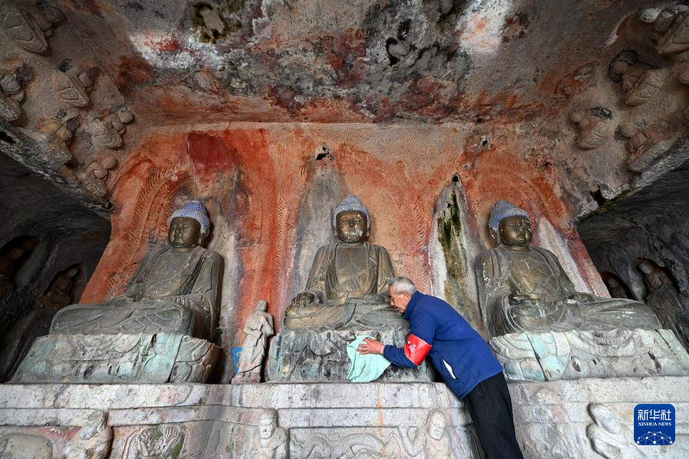 3月26日,馮開平在金燈寺水陸殿擦拭佛像。