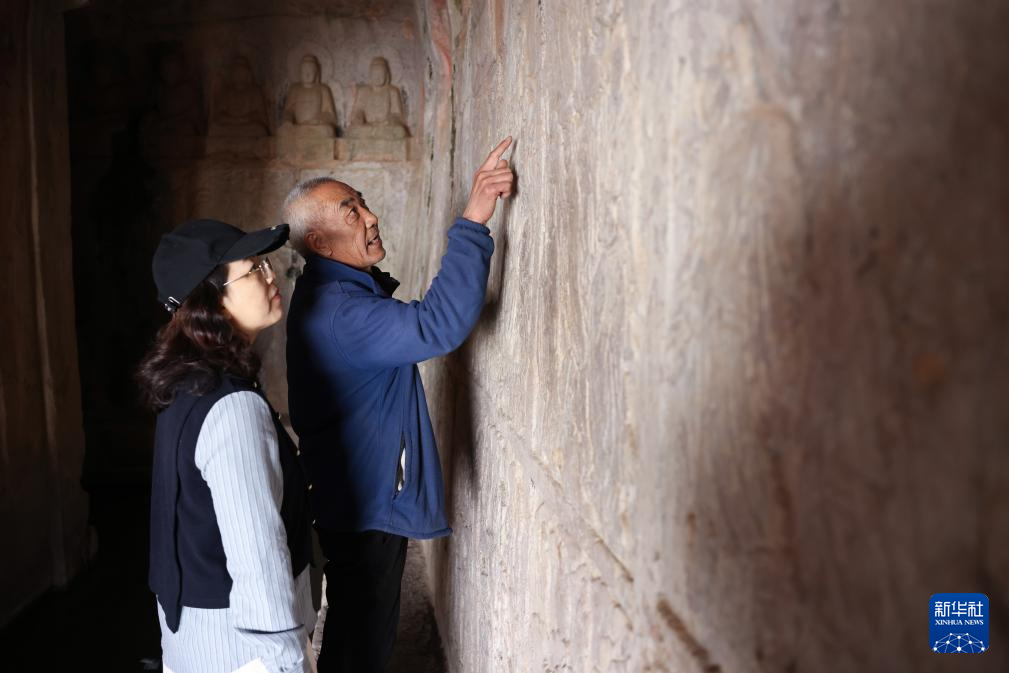 3月25日,馮開平在查看金燈寺水陸殿內的浮雕壁畫。