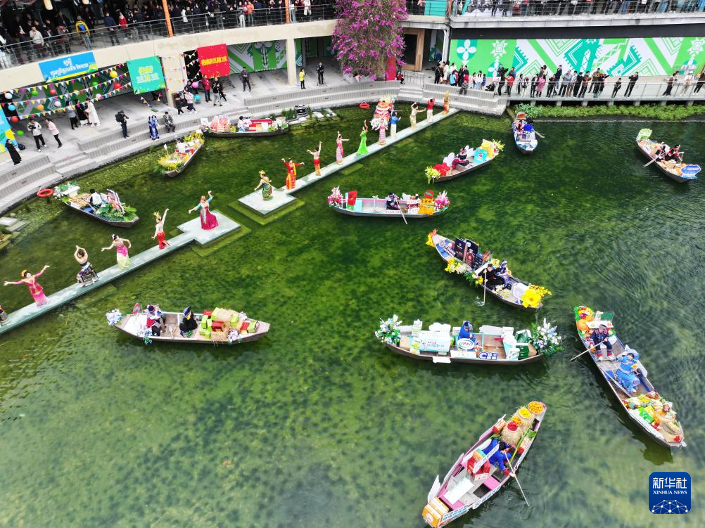 這是3月31日拍攝的開幕式現場的水上市集(無人機照片)。