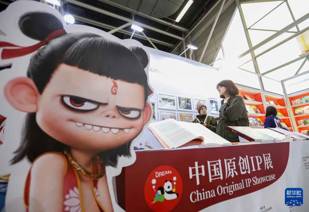 這是4月1日在第62屆博洛尼亞國際兒童書展中國展區拍攝的哪吒主題展板。