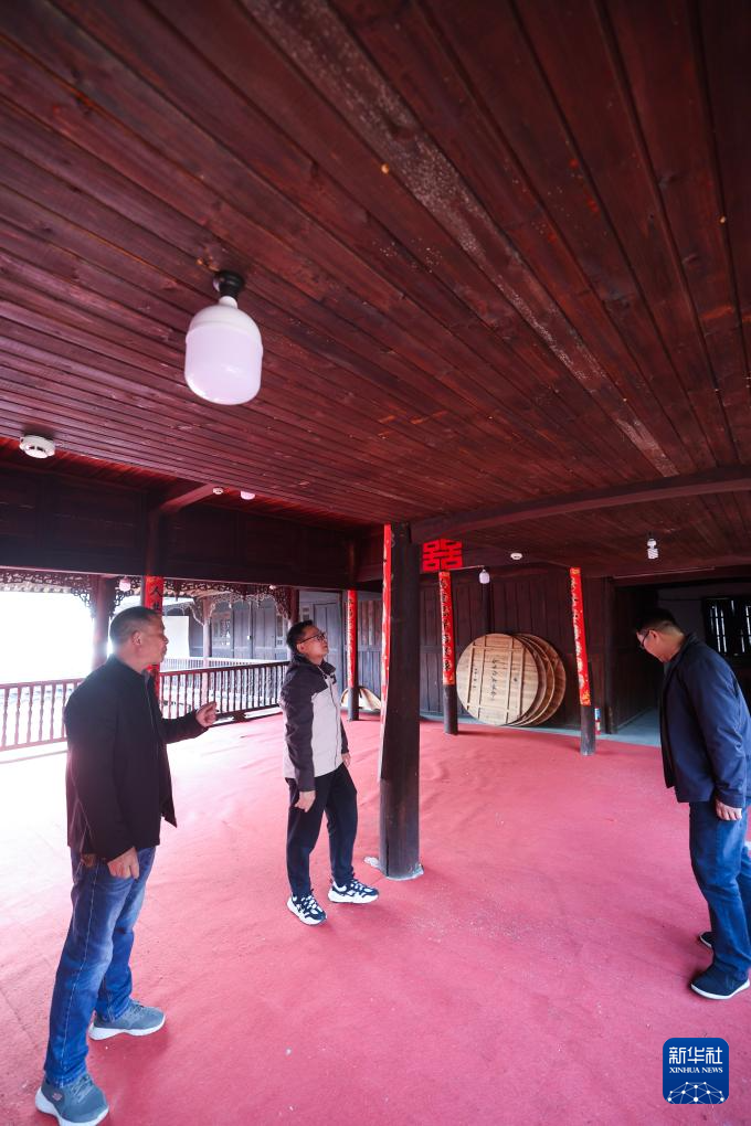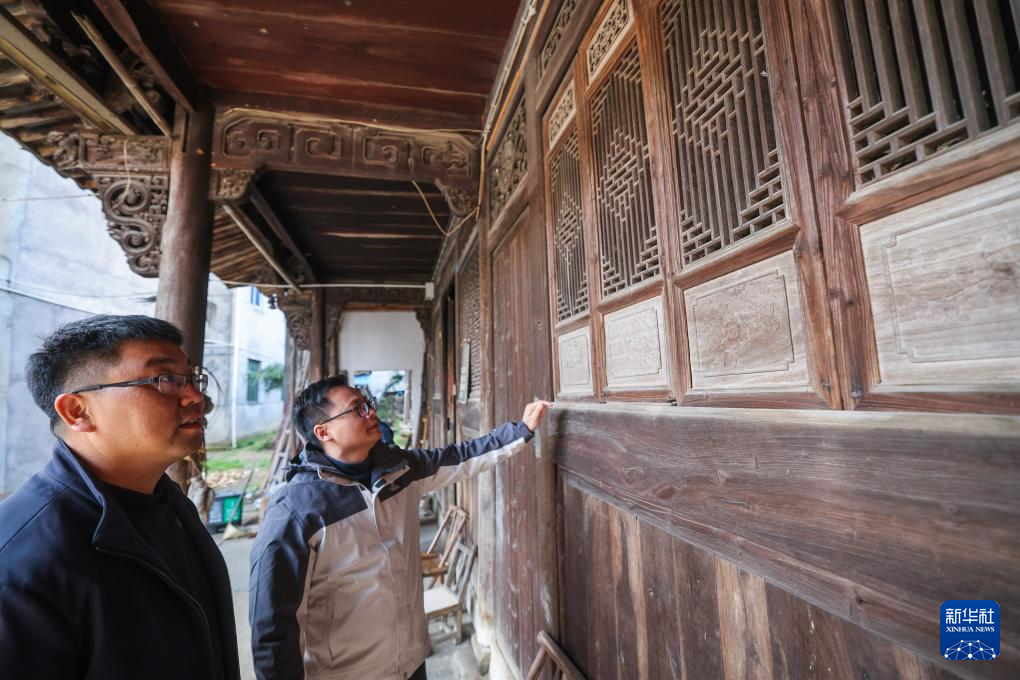 4月1日,嶺北鎮文化特派員、浙江工業職業技術學院的講師李亞(右)與嶺北鎮黨委委員樓炳在查看古建筑的維保現狀。