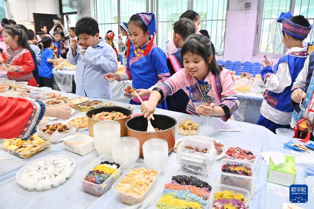 孩子們在廣西南寧市民族大道東段小學品嘗美食(3月27日攝)。新華社記者 周華 攝