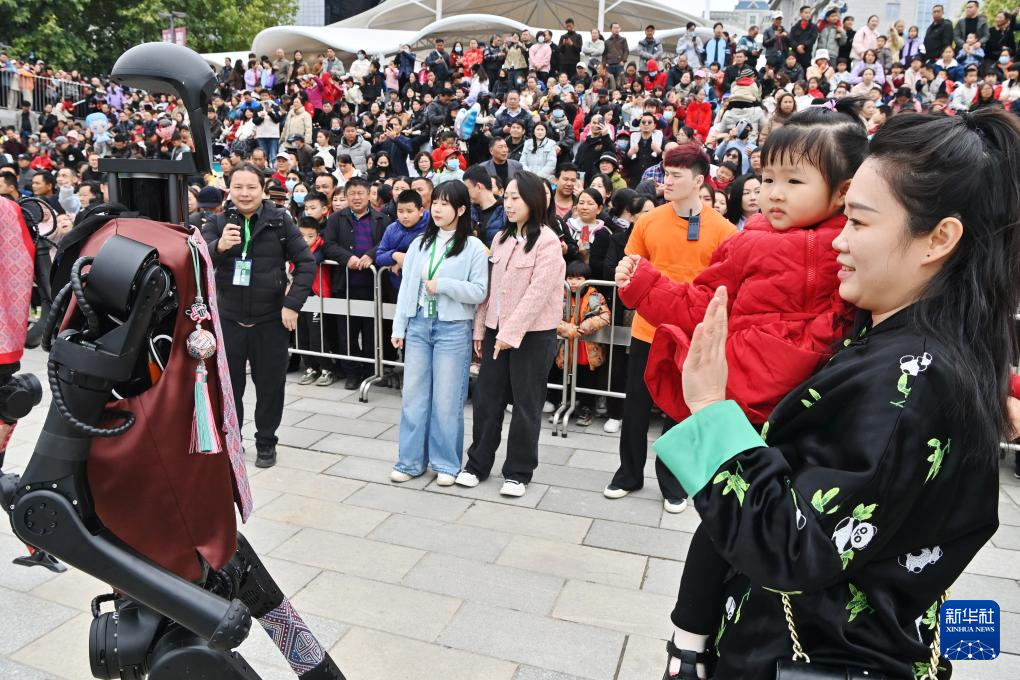 游客在南寧舉行的“廣西三月三·八桂嘉年華”開幕式現場跟機器人打招呼(3月31日攝)。新華社記者 周華 攝