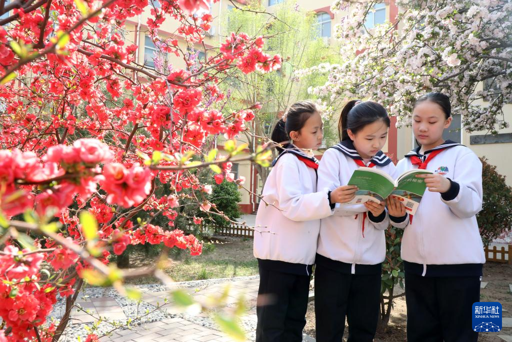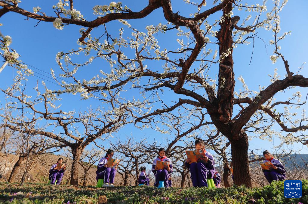 4月2日,河北省遵化市地北頭鎮魯家峪九年一貫制學校組織開展讀書日活動,朗讀社團學生在果園讀書。