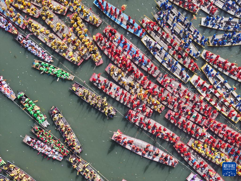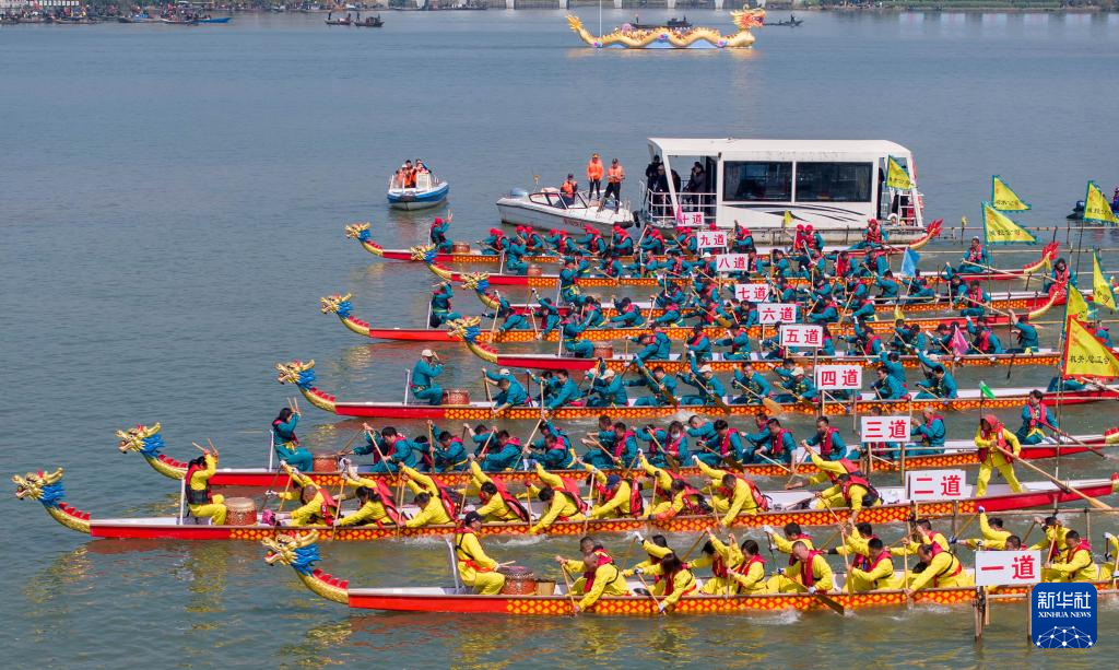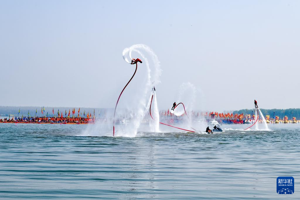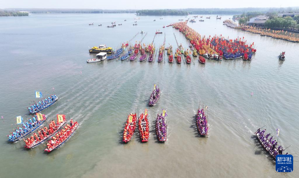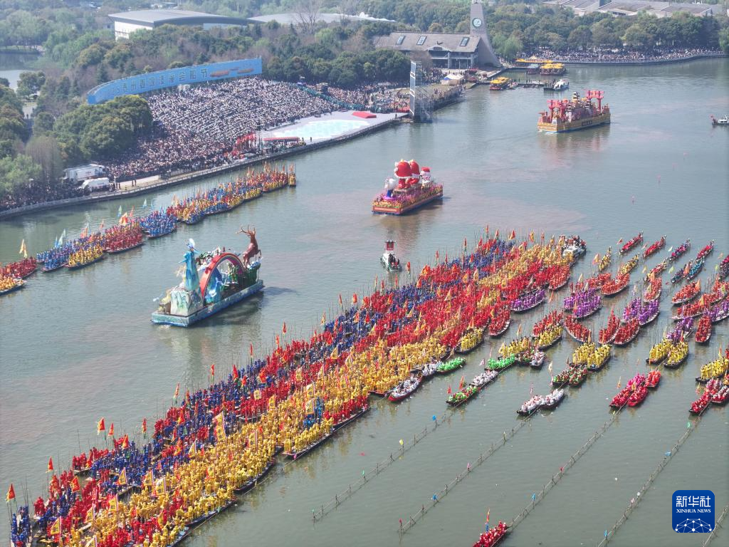 4月6日,龍船行駛在湖面上(無人機照片)。