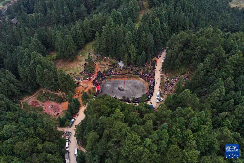 這是4月6日拍攝的貴州省錦屏縣固本鄉2025年新民片區三月初九牯藏節斗牛民俗活動現場(無人機照片)。