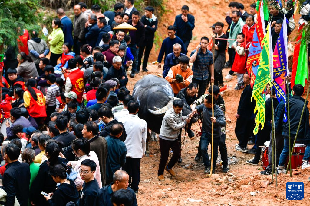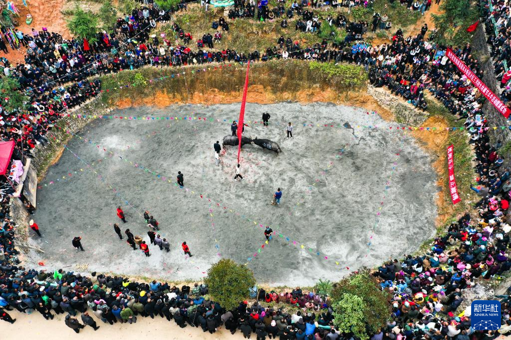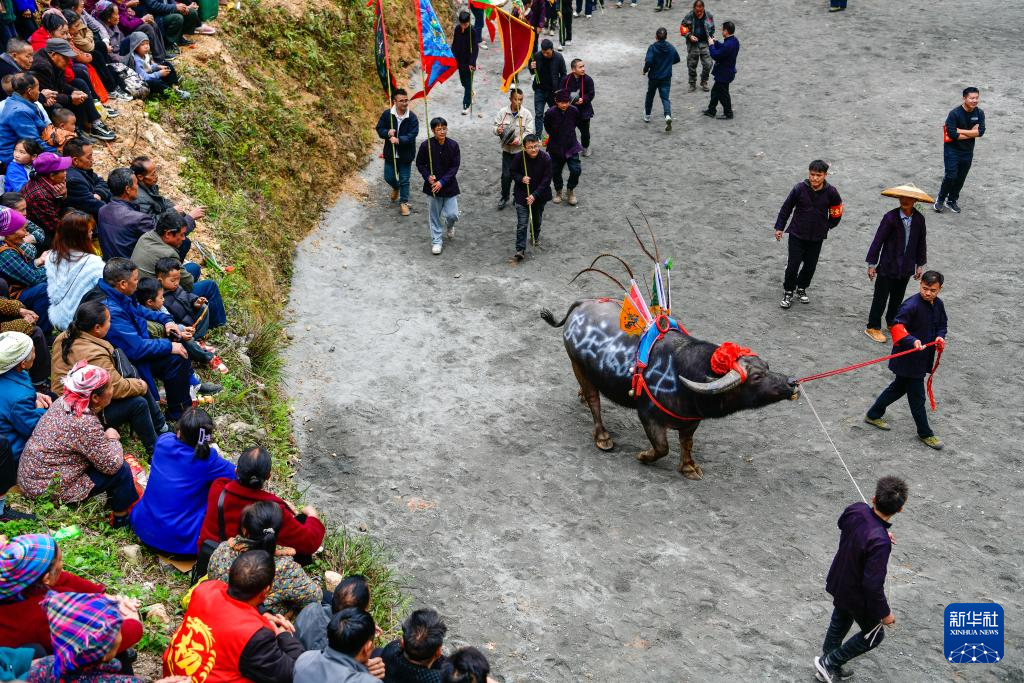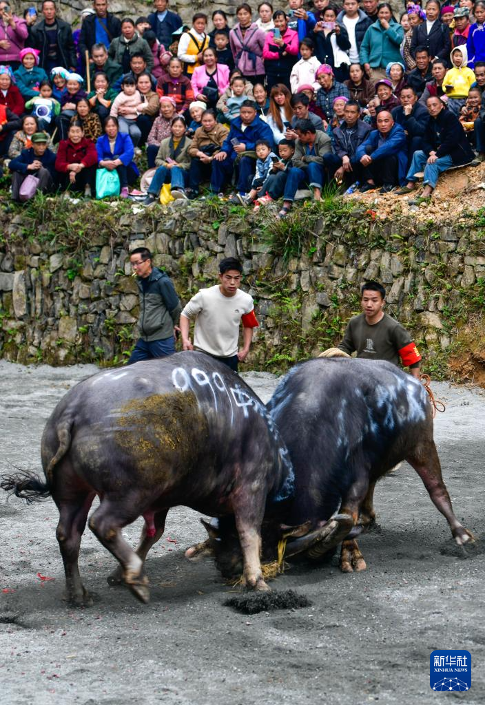 當日,貴州省黔東南苗族侗族自治州錦屏縣固本鄉舉辦2025年新民片區三月初九牯藏節斗牛民俗活動,來自各苗鄉侗寨的人們齊聚斗牛塘,斗牛歡慶牯藏節。