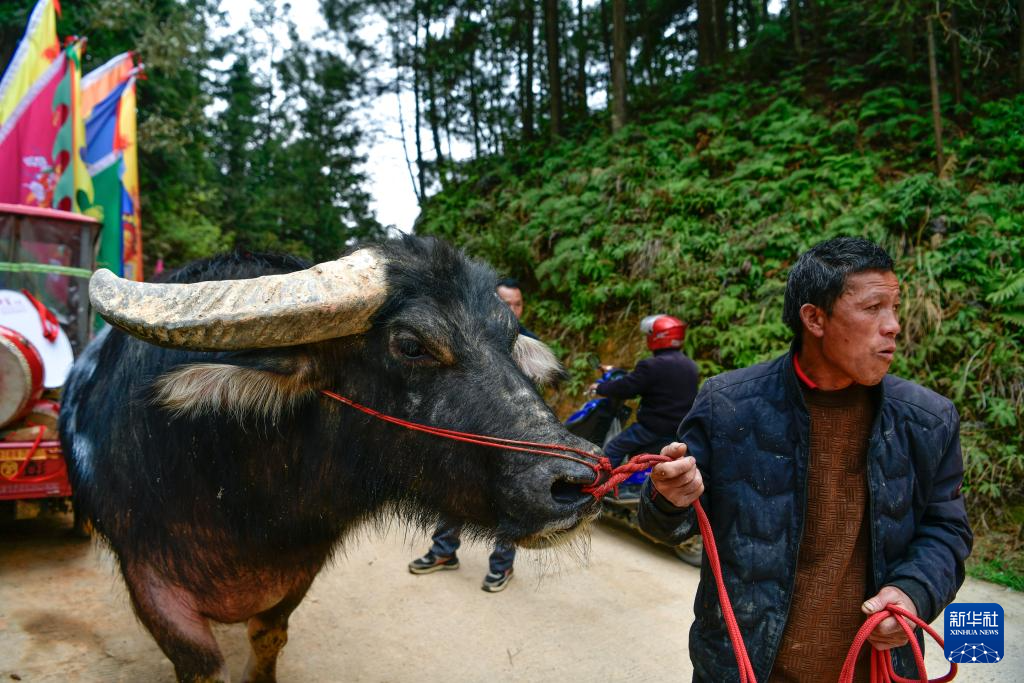 4月6日,在貴州省錦屏縣固本鄉東莊村,參加斗牛活動的水牯牛準備入場。