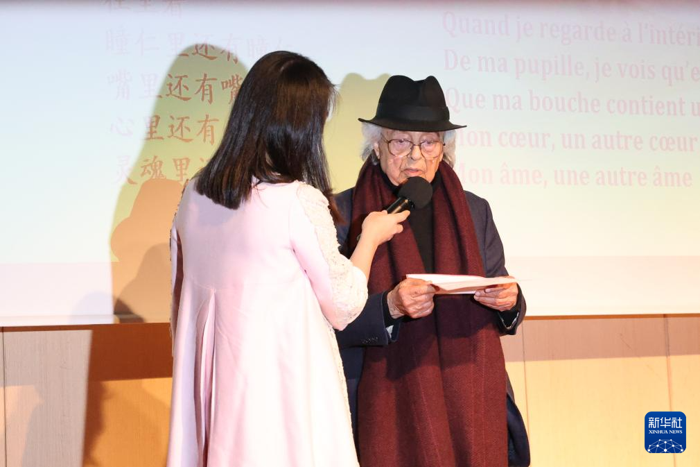 4月8日,在法國巴黎中國文化中心舉辦的“詩歌的邂逅——‘話中國’中法詩會”現場,敘利亞詩人阿多尼斯(右)用阿拉伯語朗讀詩歌。新華社記者 張百慧 攝