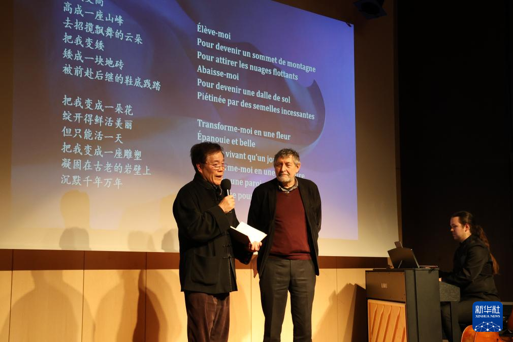 4月8日,在法國巴黎中國文化中心舉辦的“詩歌的邂逅——‘話中國’中法詩會”現場,中國詩人趙麗宏(左)與法國詩人讓-皮埃爾·西梅翁(右)分別用中文和法語朗讀中國詩歌。新華社記者 張百慧 攝
