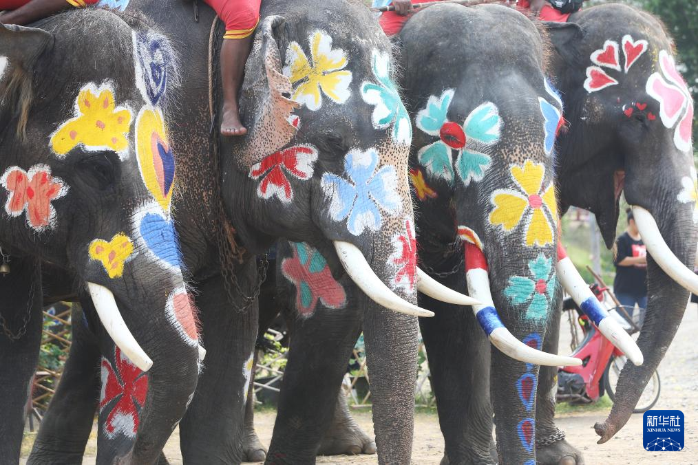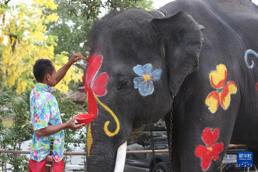 4月10日,在泰國大城府,一名男子為大象進行彩繪。