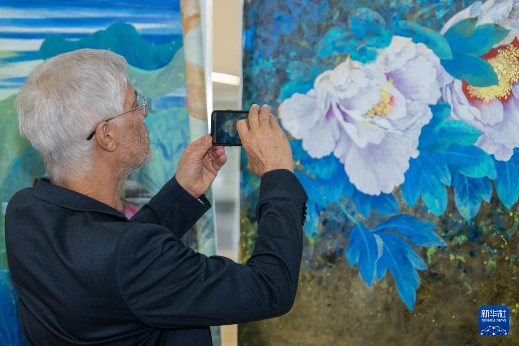 4月9日,在巴西戈亞斯州首府戈亞尼亞,一名觀眾拍攝中國花鳥工筆畫。