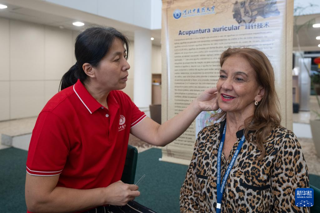 4月9日,在巴西戈亞斯州首府戈亞尼亞,中醫孔子學院的老師為一名體驗者實施耳穴療法。