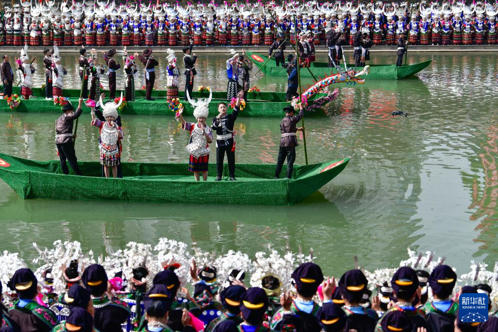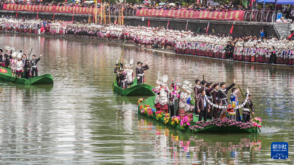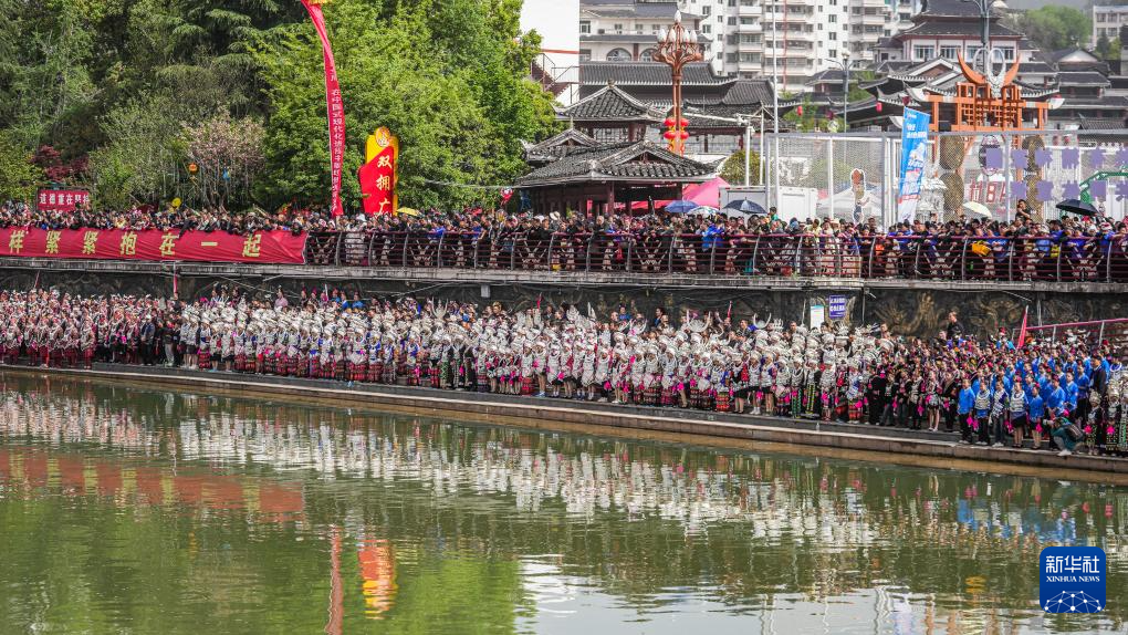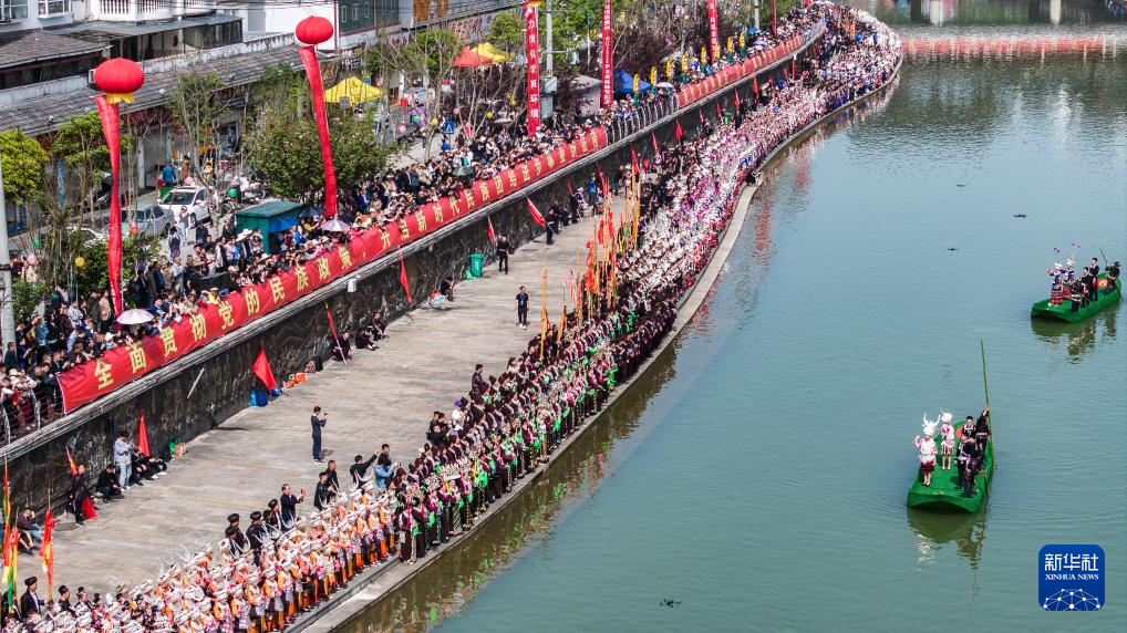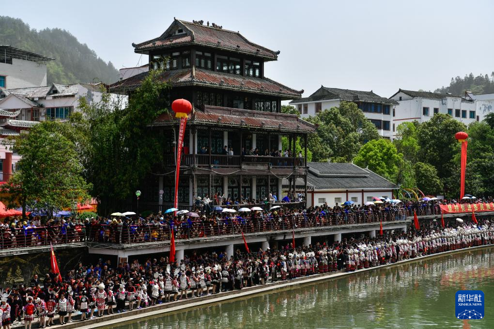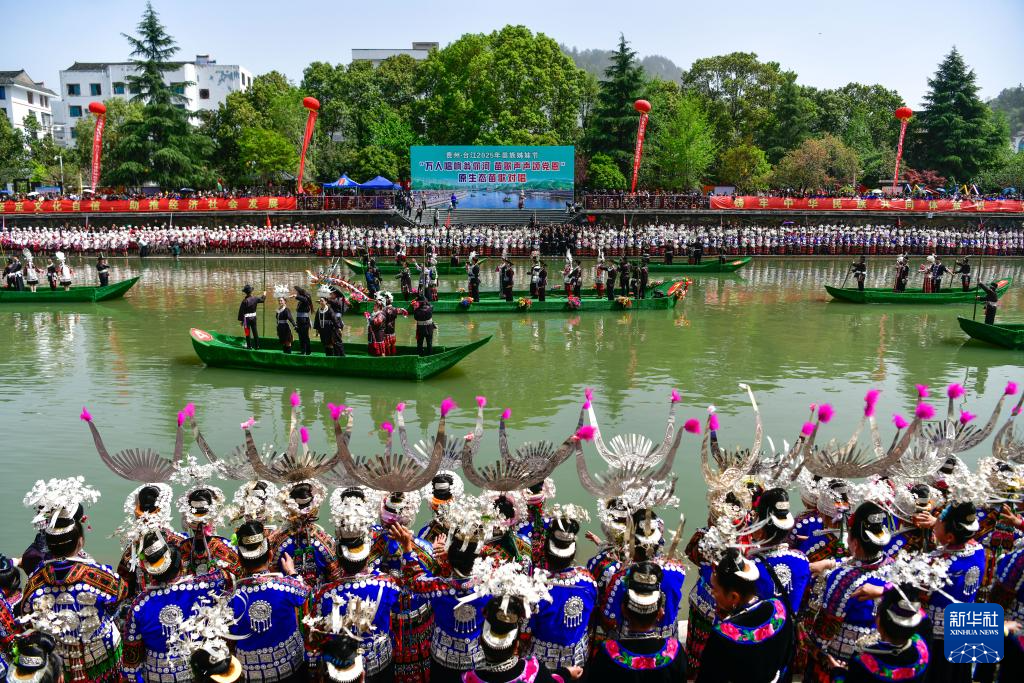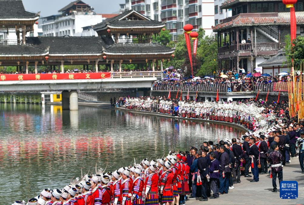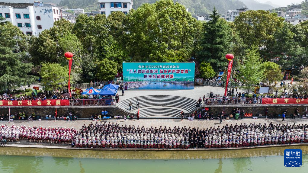 當日,貴州臺江2025年苗族姊妹節苗歌對唱活動在臺江縣翁你河畔舉行。來自臺江縣的萬余名苗族群眾,身著節日盛裝齊聚翁你河畔,以傳統對唱的方式,向游客展現苗族飛歌、情歌,歡慶姊妹節。