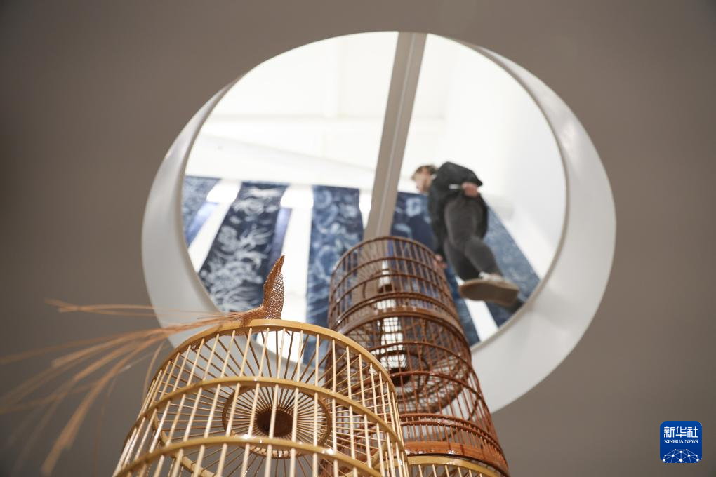 這是4月13日在意大利米蘭設計周的貴州工業設計城展區拍攝的竹編展品。