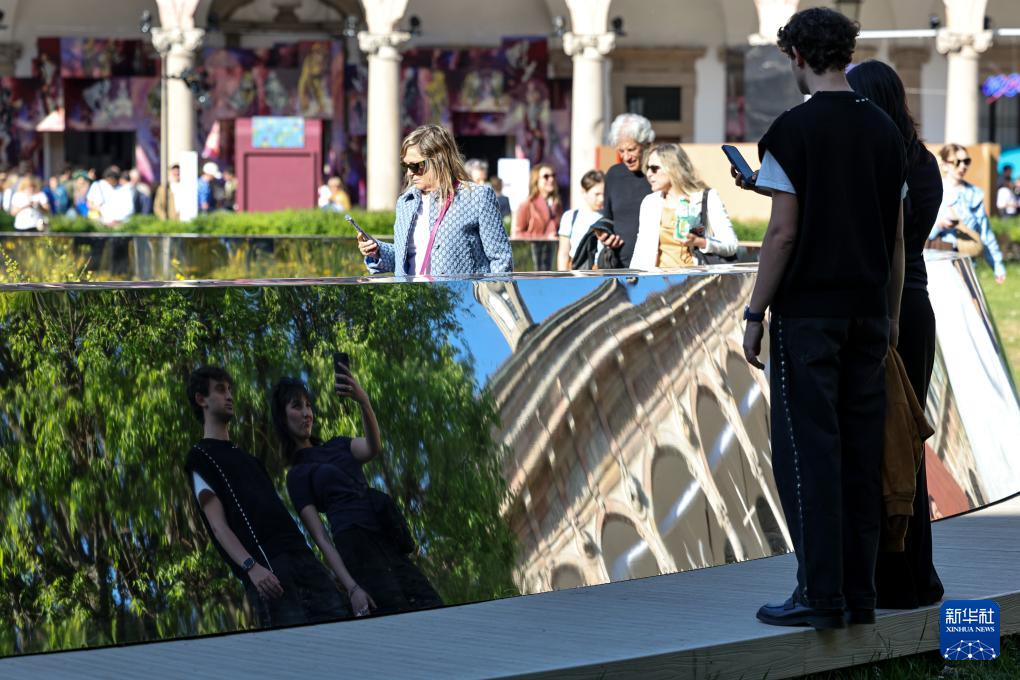 4月11日,在意大利米蘭國立大學,人們參觀中國設計師陳耀光的鏡面裝置作品《禮物》。