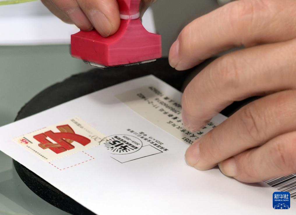 4月15日,在北京市西城區集郵營業廳,集郵愛好者在其購買的《全民國家安全教育日10周年》首日封上加蓋主題紀念郵戳。