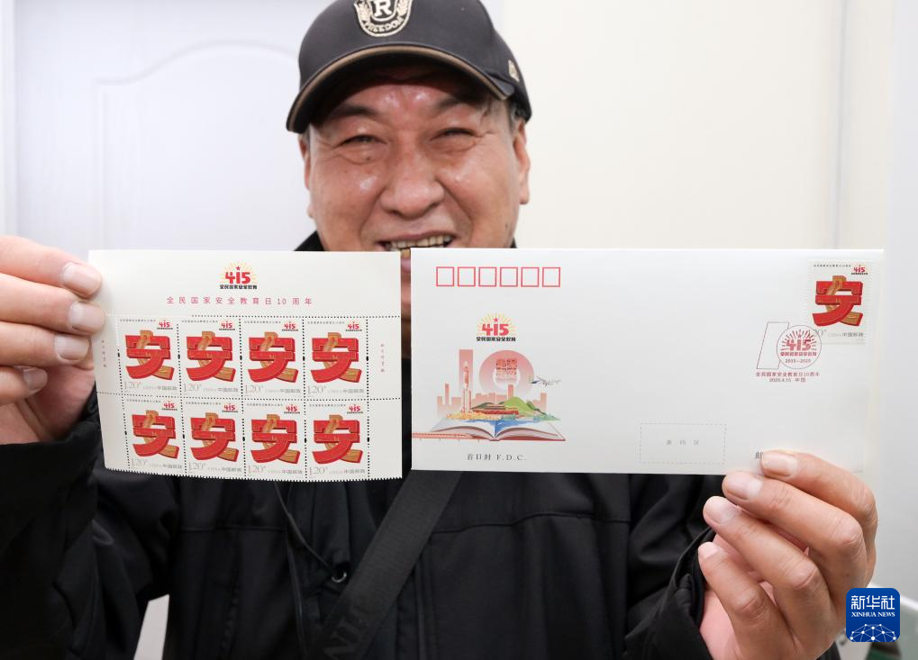 4月15日,郵迷在北京市西城區集郵營業廳展示《全民國家安全教育日10周年》紀念郵票和首日封。