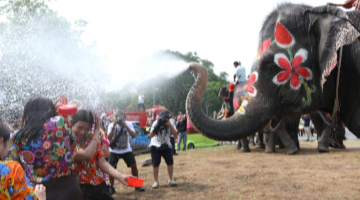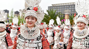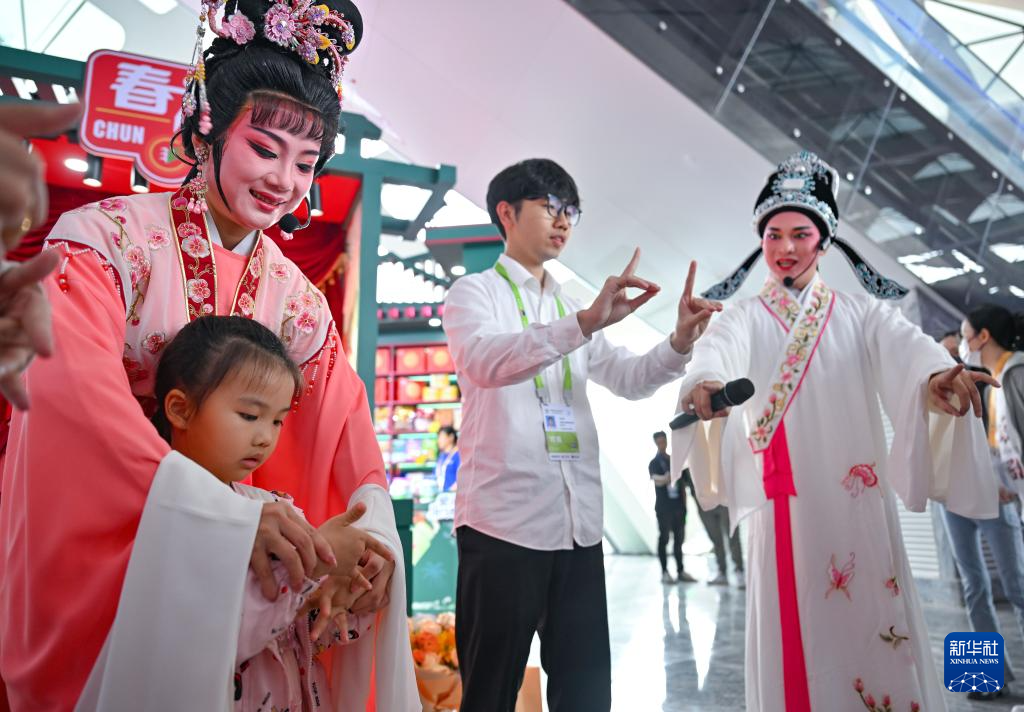 4月13日,瓊劇演員在消博會上與觀眾互動。瓊劇是國家級非物質文化遺產。